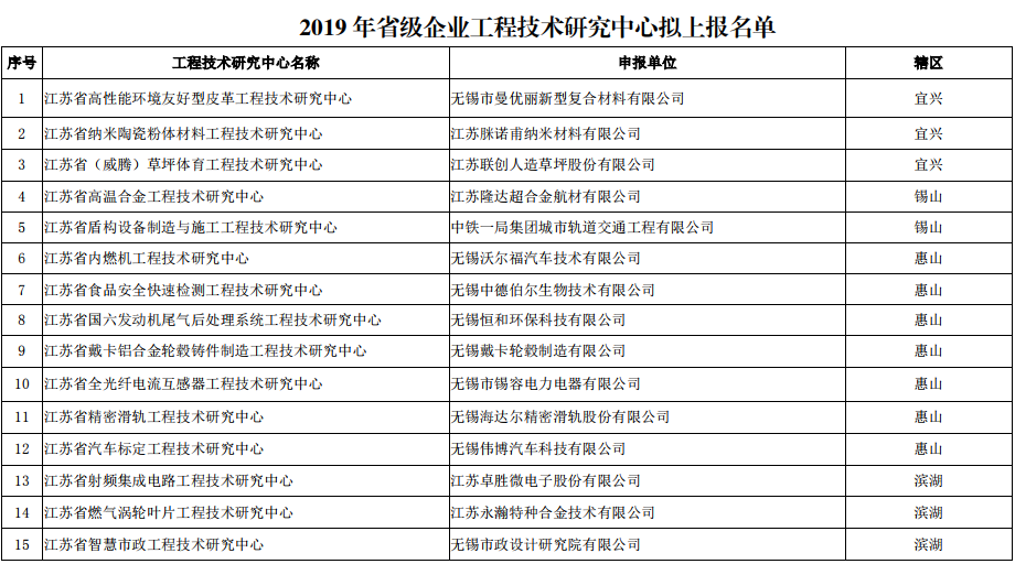 根據《關于做好2019年省級企業(yè)工程技術研究中心及省級企業(yè)院士工作站建設工作的通知》(蘇科研函〔2019〕264號)和《關于下放省級工程技術研究中心和省級企業(yè)人才站點管理權限的通知》(蘇科條發(fā)〔2015〕136號)的要求,受省科技廳委托,科技局對申報2019年省級企業(yè)工程技術研究中心的項目進行了評審?,F(xiàn)將擬上報結果進行公示,公示時間5個工作日(自2019年8月26日至8月30日)。 任何單位和個人如對公示項目有異議,可在公示期內以書面形式提出,并列舉異議理由和相關證明材料。以單位名義提出的,需加蓋單位公章;以個人名義提出的,需寫明自己的真實姓名、單位、職務職稱、聯(lián)系地址及電話等。 監(jiān)督電話:81821912 咨詢電話:81821907?
